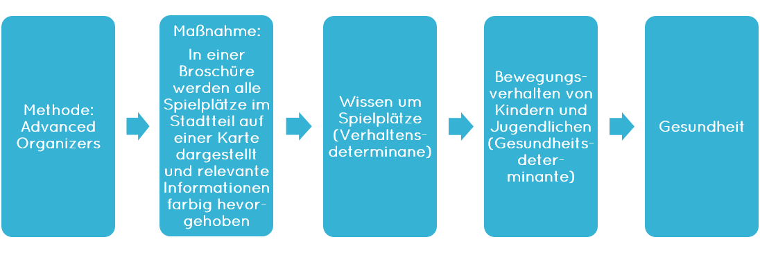 Nachdem die Einflussfaktoren auf die Gesundheitsdeterminante identifiziert sind, stellt sich nach dem Gesetz der indirekten Wirkung die Frage, wie eine zu entwickelnde Maßnahme aussieht, dass Sie die Einflussfaktoren verändern kann. Also in dem hier gewählten Beispiel wurden als Einflussfaktoren, einerseits das Wissen um Spielplätze von Kindern bzw. deren Familienangehörigen und andererseits die Veränderung der Wohnumgebung hinsichtlich einer Verfügbarkeit vielfältiger Bewegungsmöglichkeiten wie Spielplätze identifiziert/gewählt. Doch wie kann das Wissen bzw. die Veränderung der Wohnumgebung nun hergestellt werden?